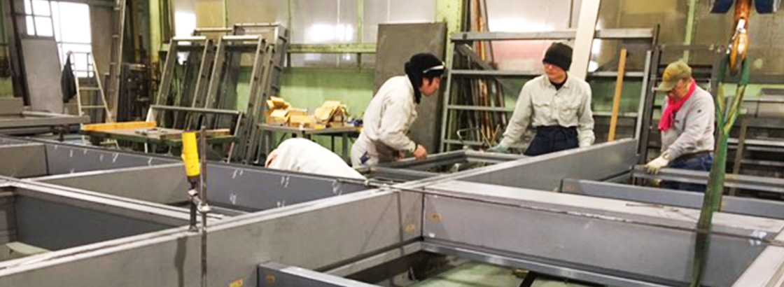 材料は、鋼板だけでなく、形鋼や鋼材を使用した大型サッシドア、重量物サッシドア、その他あらゆる鉄骨の特殊仕様構造物も製作しています。